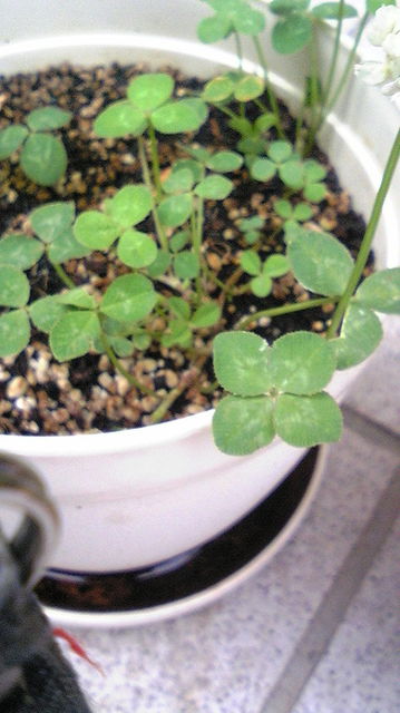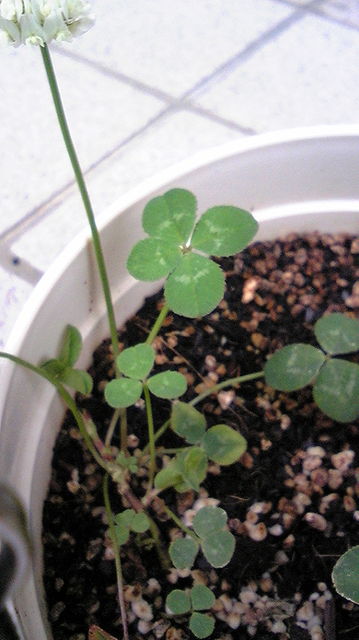 玄関先のクローバーの鉢植えに四葉が混じっていました。
