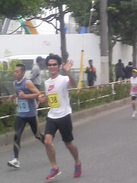 川沿いの道を東へ進み、大通り前でUターン、葛西橋通りへ向かう道へ曲がる直前、だんだんと集団がバラけてきて、ペースの上がる人とペース落ちる人が出てくるので、後ろから追い越されたり、前から落ちてくる人に吊られて、ついつい挫けそうになるところですが、川を越えて渡ってきた嫁たちが応援してくれてたので復活できました。