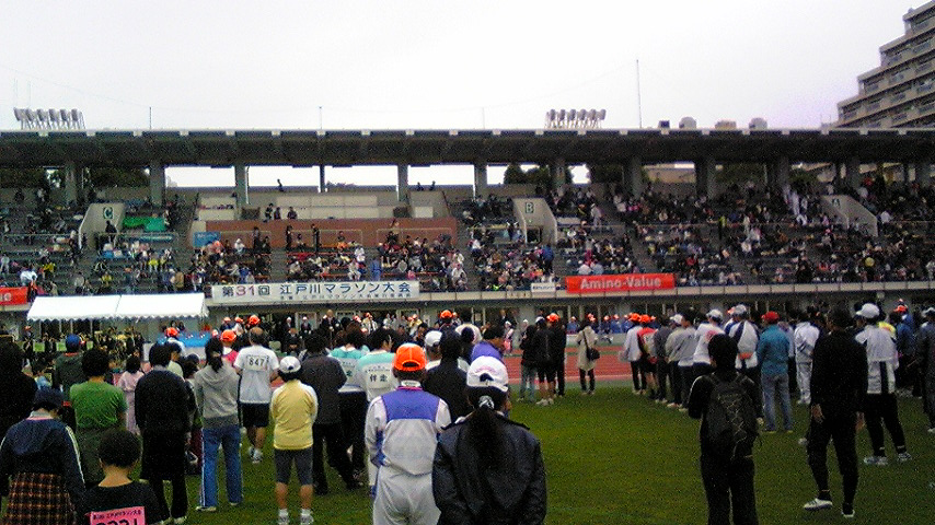 この江戸川区民マラソンは、親子マラソンが人気あるらしくグラウンドには子供がイッパイです。