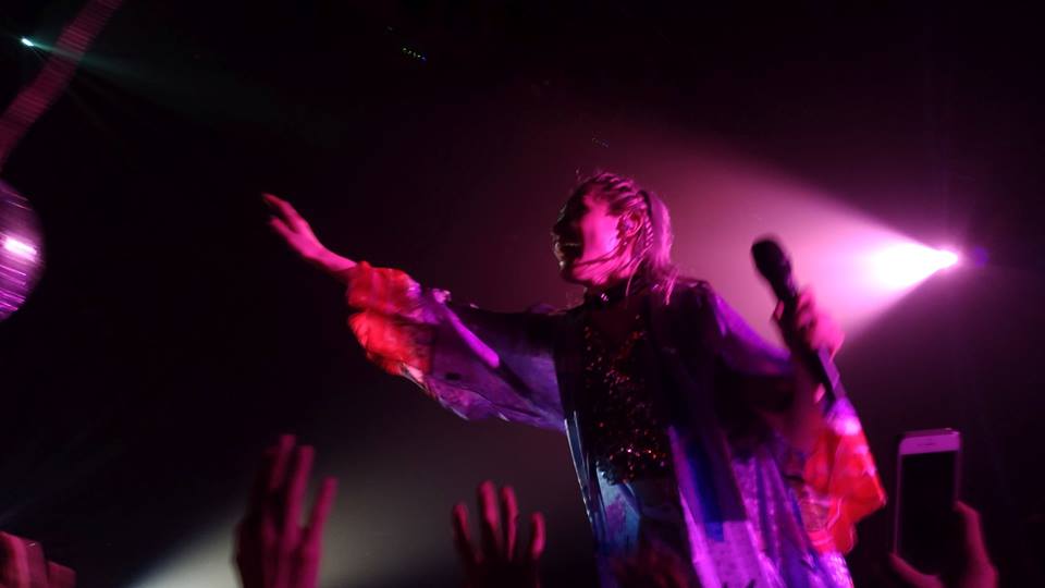 開始時間が過ぎても、なかなか始まらず、やっと照明が落ちて始まるかなぁ〜と思ったら、蒸し蒸しした空気とオープニングの雰囲気のせいで倒れる人が出てしまい、更に始まりが遅れるというグダグダなオープニングでしたが、コムアイが台に乗って会場の中央に出てくると、一気にヒートアップ。